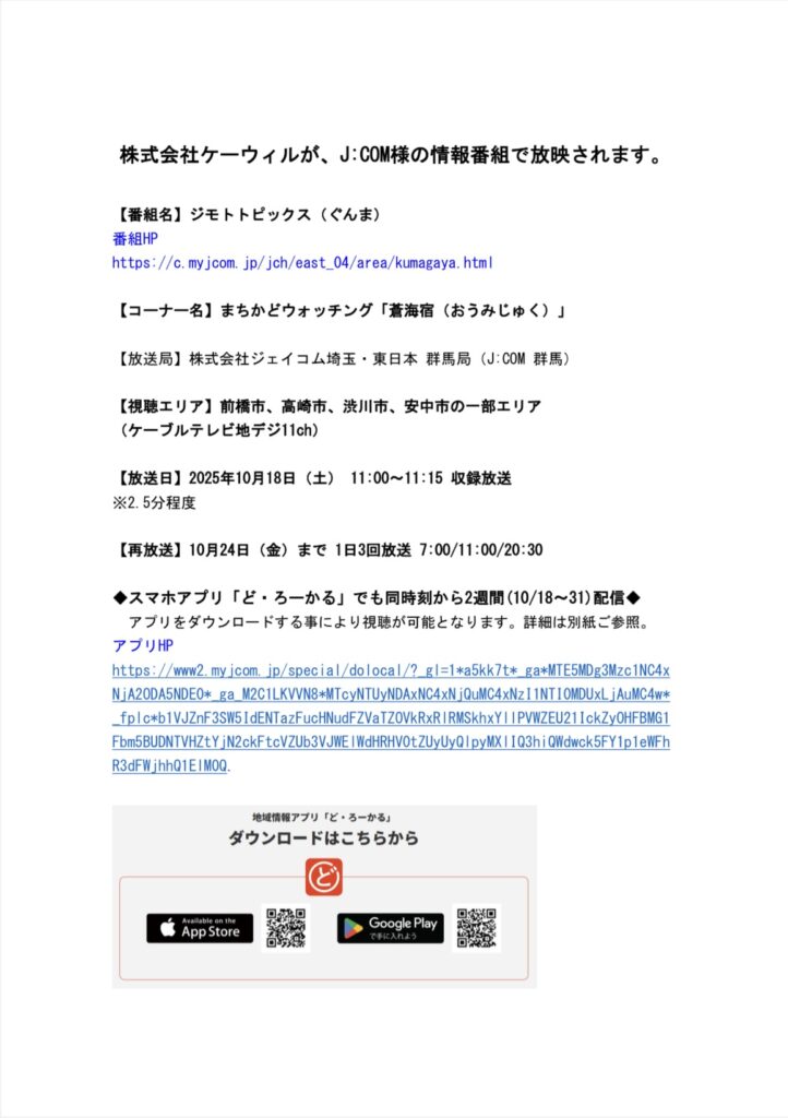 株式会社ケーウィルが、J:COM様の情報番組で放映されました